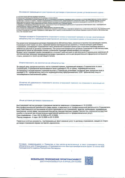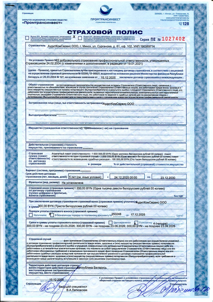 The contract of insurance No. PE 1027402 of December 19, 2025 (valid for December 23, 2030) is concluded on the terms of rules of voluntary insurance of civil liability for damnification and expenses in connection with the exercise of professional activities to the amount of 1,000,000.00 (one million Belarussian rubles).